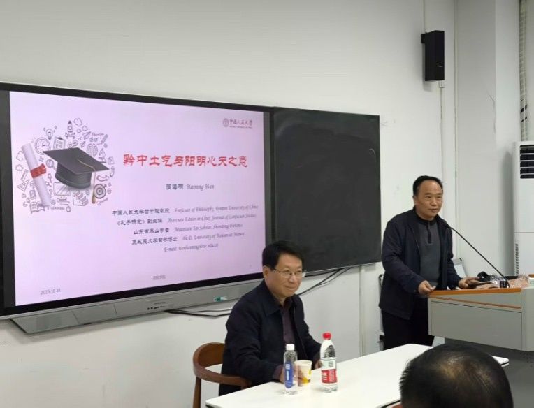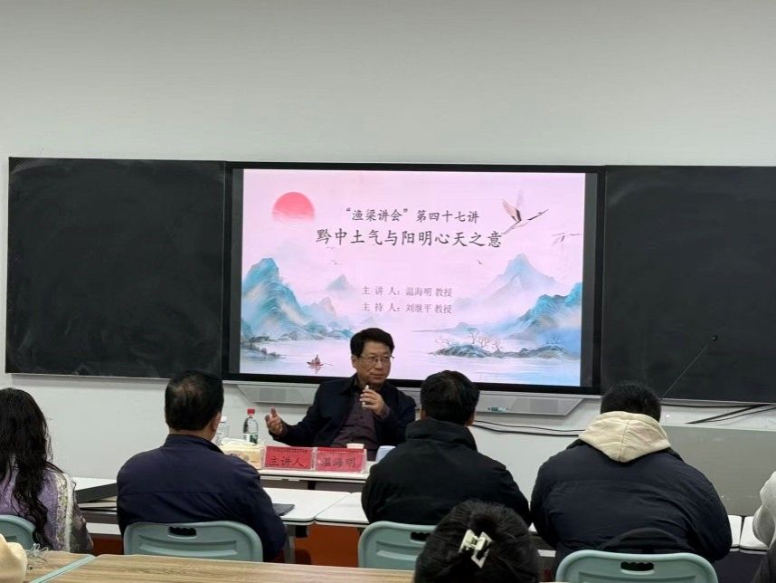 2025年10月31日星期五上午9:30—11:30,阳明学与黔学研究院、科研处、学报编辑部和研究生管理处邀请中国人民大学哲学院教授、博士生导师、美国夏威夷大学比较哲学博士温海明教授,以“黔中土气与阳明心天之意”为题,在学校大学生活动中心208教室主讲第四十七讲“鱼梁讲会”讲座。由阳明学与黔学研究院党支部书记、副院长刘继平教授主持,阳明学与黔学研究院师生到场聆听。