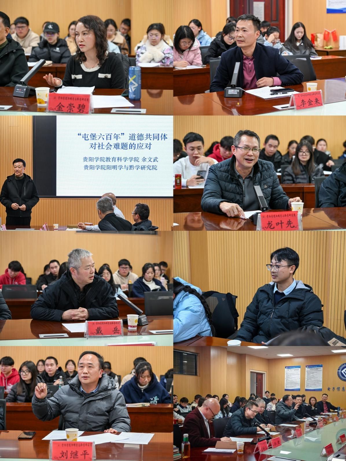我校多个部门的师生代表在研讨会上发表了精彩见解。马克思主义学院金崇碧教授为大家分享了中华传统文化从民族性到世界性的融合路径,尤其是阳明心学与马克思主义融合发展的路径和方法,引发思考学生思考和追问;教育科学学院余文武教授结合自己完成两个国家课题的经验,通过安顺屯堡文化的个案研究,揭示了其中潜藏的道德共同体与伦理实践,引起大家对屯堡文化的强烈兴趣;学报编辑部戴岳教授强调了哲学对推动理性和反思的重要价值,指出哲学应当服务于生活,反思提升智慧;阳明学与黔学研究院刘继平教授系统阐述了王阳明对儒家“乐”思想的继承与发展;学报编辑部李金来教授则从文字学角度出发,论证了中国哲学作为“心的哲学”的特质,并以陶渊明的名字陶潜为例,希望同学们激发潜能,做不一样自己;马克思主义学院龙叶先教授探讨了阳明心学与马克思主义哲学的结合点,回应了关于唯心唯物对立的质疑,认为唯物唯心在不同的文化背景下有不同的含义,不能简单比附;电通学院代天军博士则从物理学、量子力学角度抛出了“量子纠缠”与中国哲学“物”的问题,引起了现场长达十多分钟的热烈讨论,把现场氛围推向高潮。