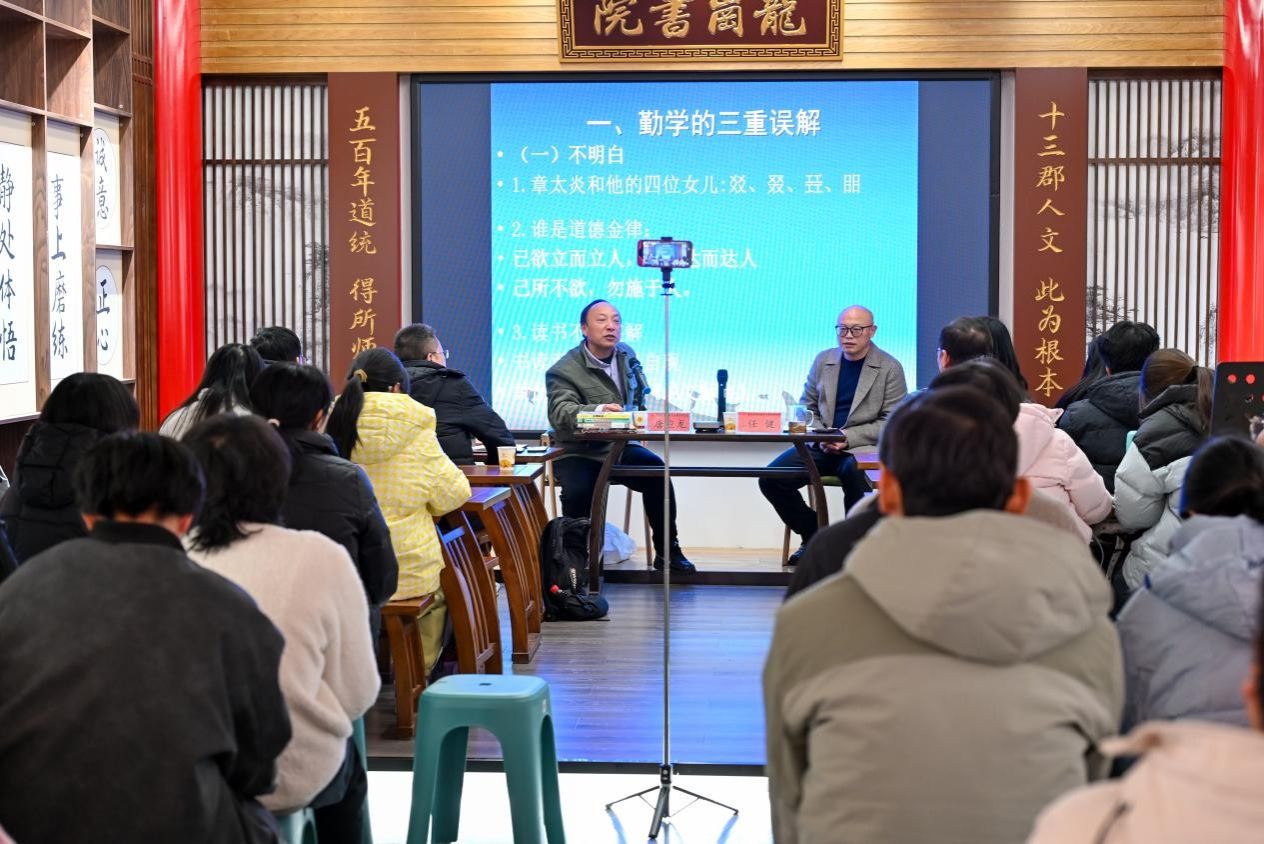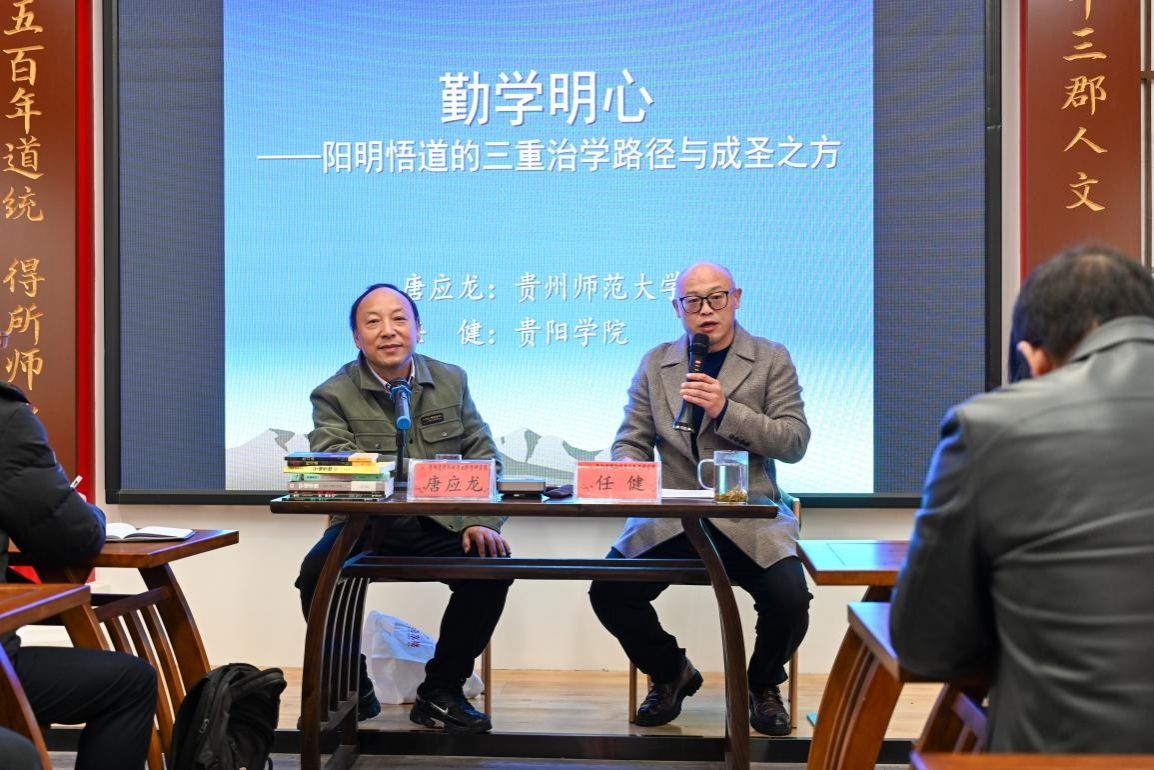 2025年12月4日,由贵阳学院阳明学与黔学研究院主办,学报编辑部、文化传媒学院、马克思主义学院协办的“阳明讲坛”第四十三讲在我校阳明文化馆举行。本次讲座以“勤学明心——王阳明龙场悟道的三重治学路径与成圣之方”为主题,突破传统单一讲座模式,创新性地采用了深度对谈的形式。特邀贵州师范大学历史与政治学院唐应龙教授与我院副院长任健教授联袂对话。讲座吸引了校内外师生、心学爱好者和企业家,齐聚一堂探寻王阳明的勤学智慧与修身之道。