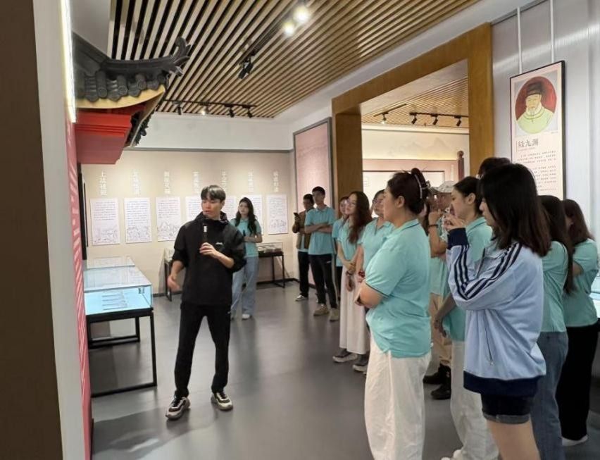 阳明学与黔学研究院中国哲学专业硕士研究生许振文带领大家参观阳明文化馆,给大家介绍了王阳明的生平及其思想源流,以及阳明学与黔学研究院在王阳明思想研究方面的学术成果。