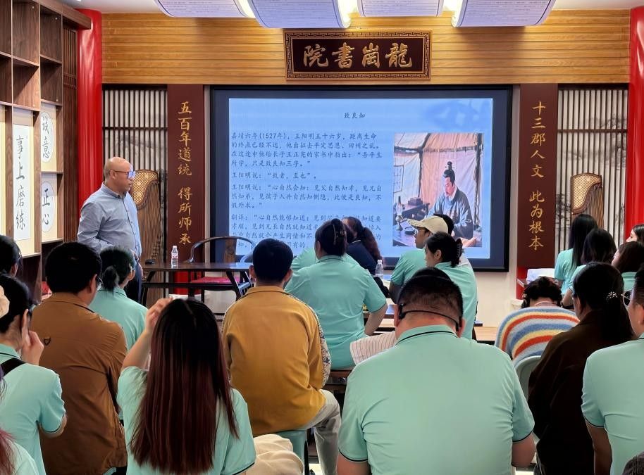 参观完毕后,阳明学与黔学研究院研究生石国成为大家做王阳明专题讲座。石国成主要介绍了王阳明的个人成长经历、主要思想“心即理”“知行合一”“致良知”“万物一体”。石国成将王阳明一生求学问道、勤学得道、讲学传道、平叛治乱等传奇经历娓娓道来,使大家对阳明先生的思想有了系统且清晰的认识,其讲座展现了较强的学术功底,赢得在场师生的肯定和赞扬。