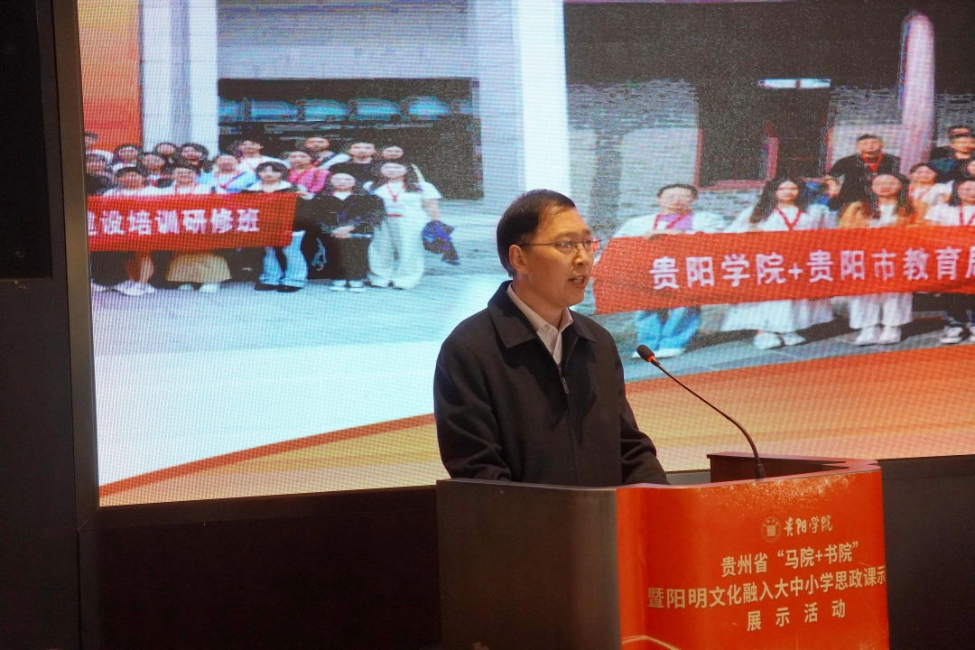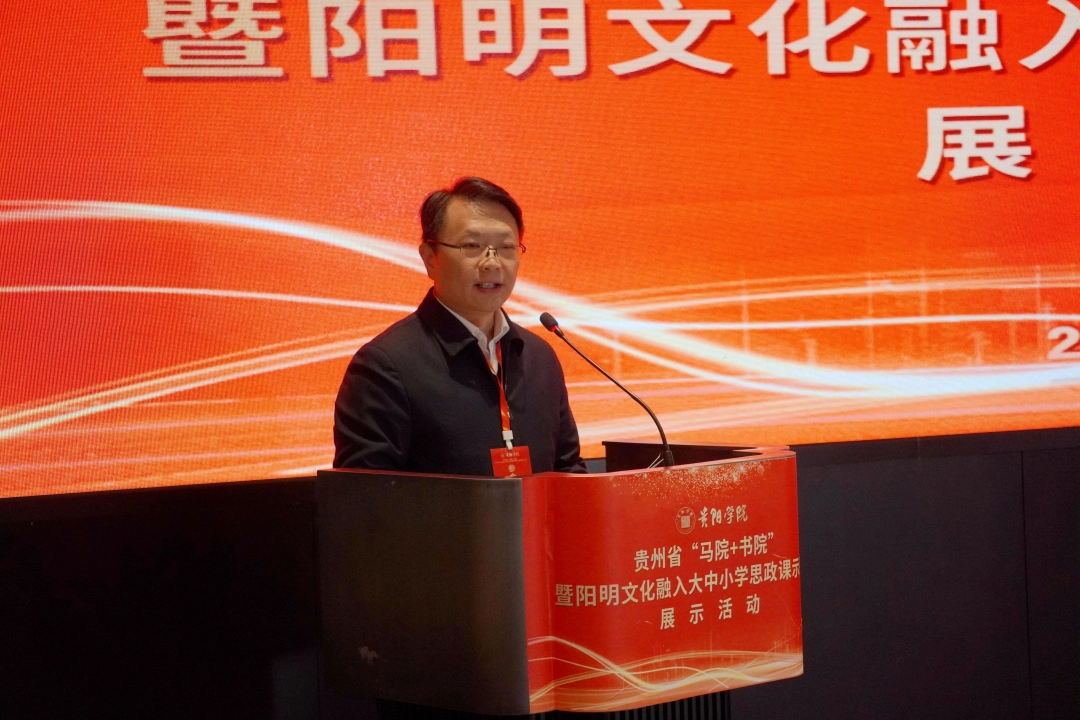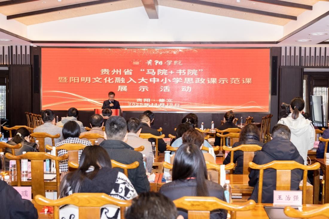 2025年11月15日,在省委教育工委、省教育厅的指导下,全省“马院+书院”暨阳明文化融入大中小学思政课示范课展示活动在中国阳明文化园龙岗书院举行。本次活动由贵阳学院、贵阳市教育局主办,贵阳学院马克思主义学院和阳明学与黔学研究院共同承办。中共贵州省委教育工委副书记李军,贵阳学院党委副书记、校长樊铁钢出席。开幕式由贵阳学院党委副书记李灿主持。