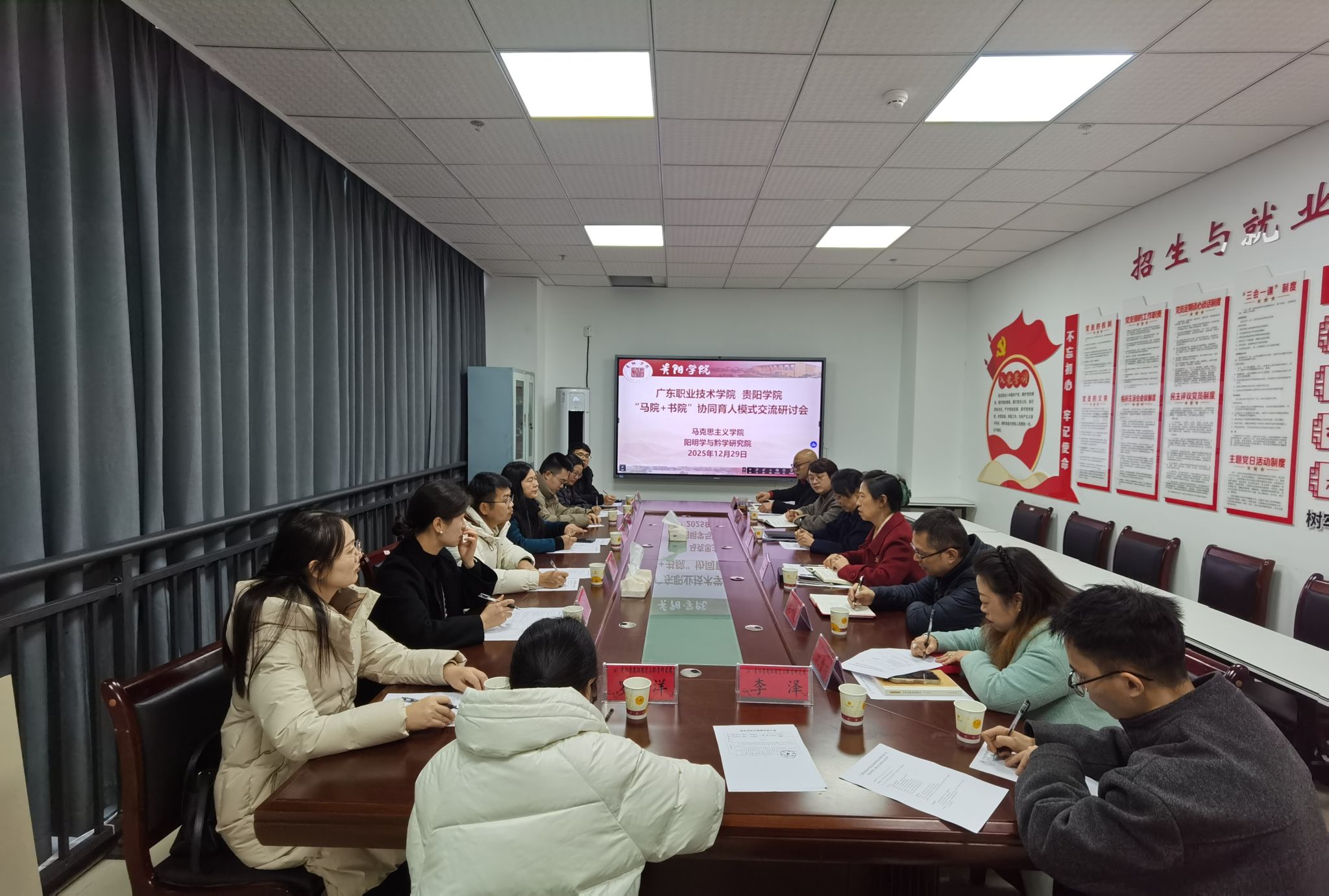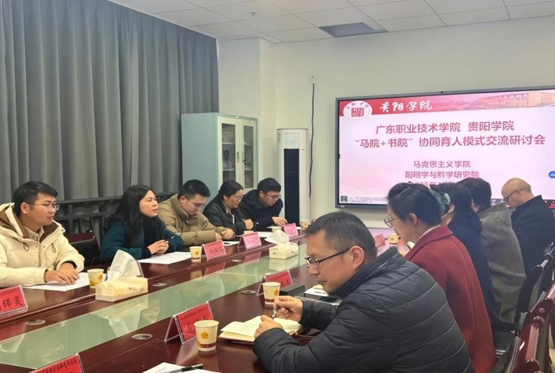 2025年12月29日,广东职业技术学院党委委员、组织宣传统战部部长游辉英与组织宣传统战一行8人到贵阳学院开展开展“马院+书院”协同育人模式交流研讨。贵阳学院党委常委、宣传部部长、统战部部长许晓璐,马克思主义学院院长何志玉,阳明学与黔学研究院副院长任健,马克思主义学院副院长龙叶先、副书记黄明珠、思想道德与法治教研室主任沈雪蓓参加交流研讨。会议由校党委宣传部部长、统战部部长许晓璐主持。