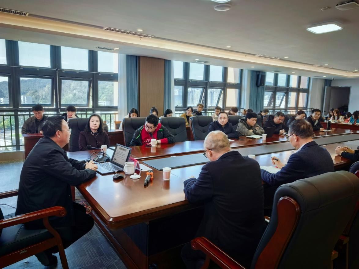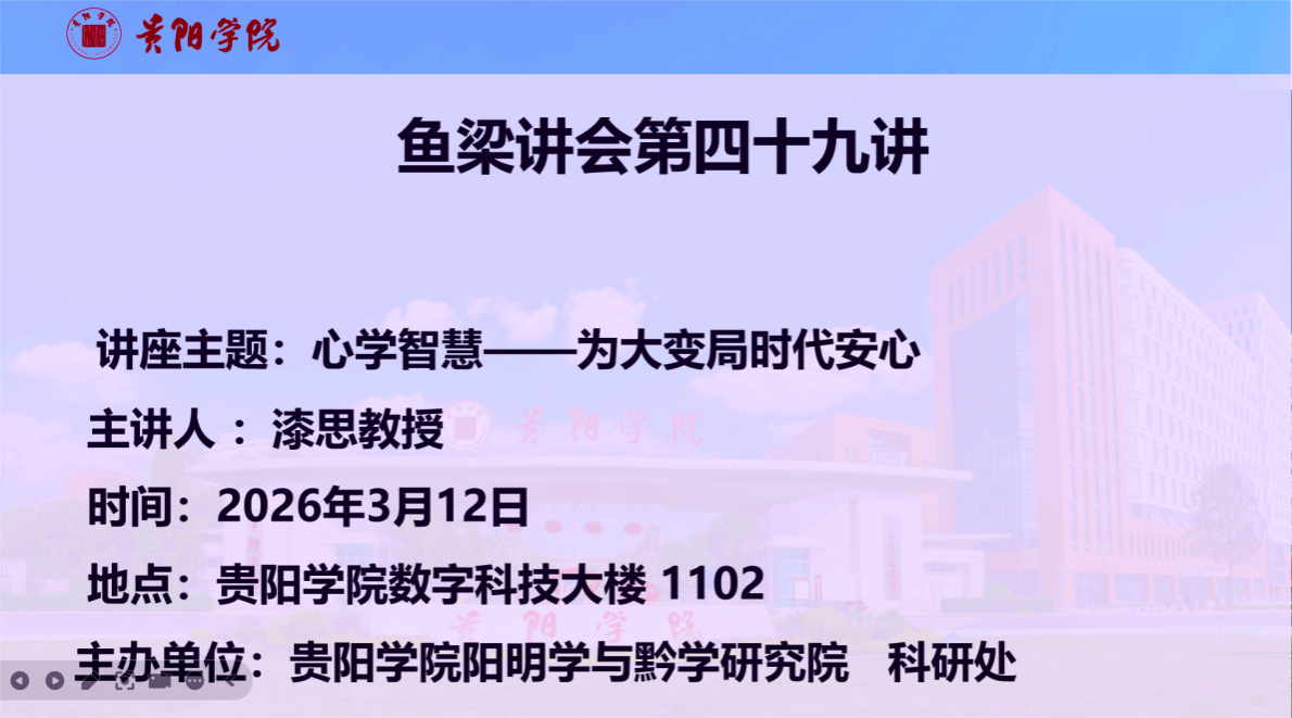 2026年3月12日下午,由阳明学与黔学研究院和科研处联合主办的鱼梁讲会第四十九讲在数字科技大楼十一楼1102会议室成功举办,本次讲座特邀贵州省社会主义学院常务副院长、二级教授漆思主讲。贵阳学院党委副书记、校长樊铁钢出席,部分教师代表和传统文化爱好者,阳明学与黔学研究院师生50余人参会。讲座由阳明学与黔学研究院副院长刘继平教授主持。