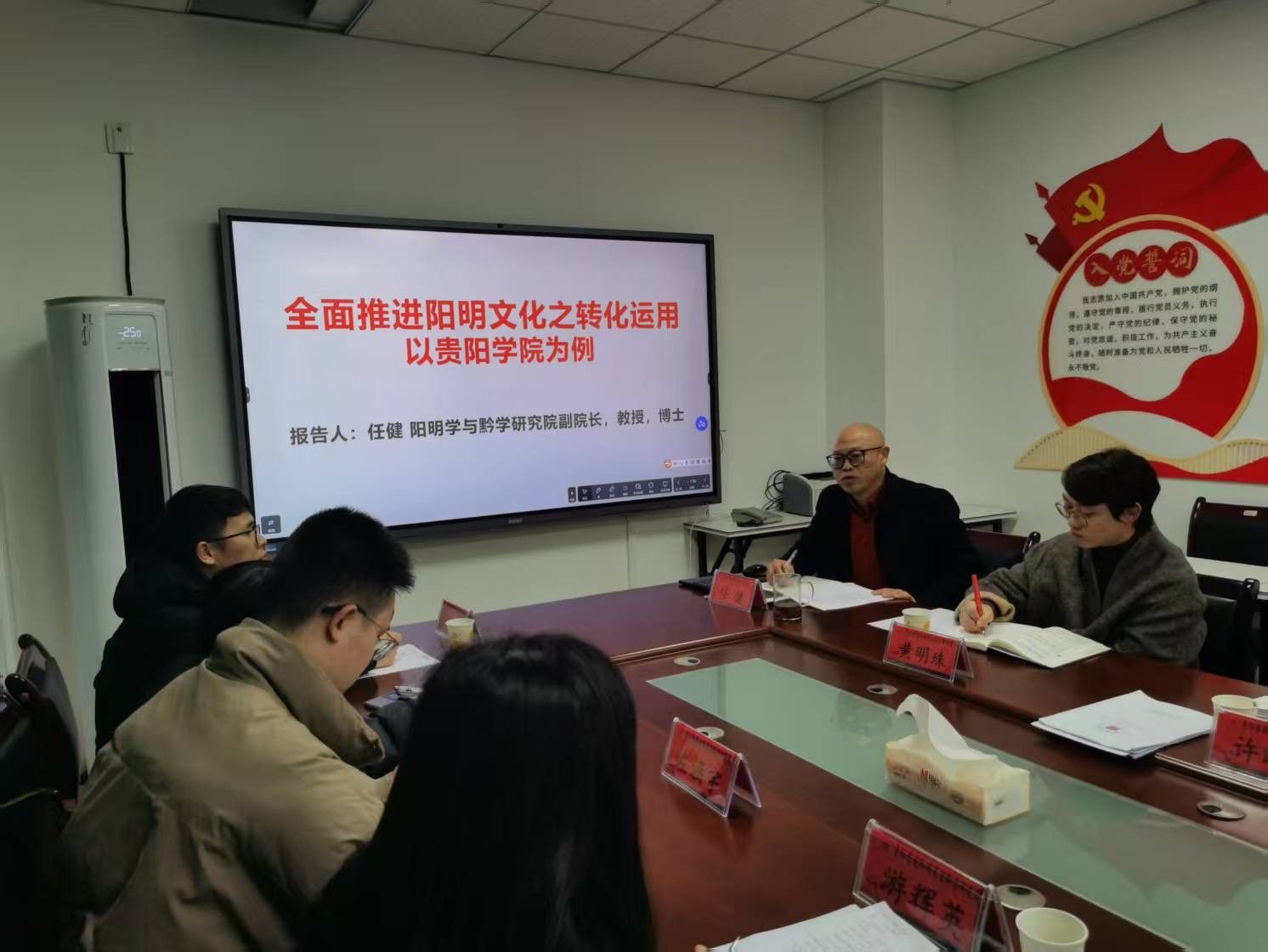 阳明学与黔学研究院副院长刘继平介绍了研究院的学科建设、人员结构、教学科研等基本情况,任健副院长对阳明文化育人、阳明文化转化运用、学术研究开展、研究生培养、研究院服务社会、中华文化书院的建设等做了详细介绍。